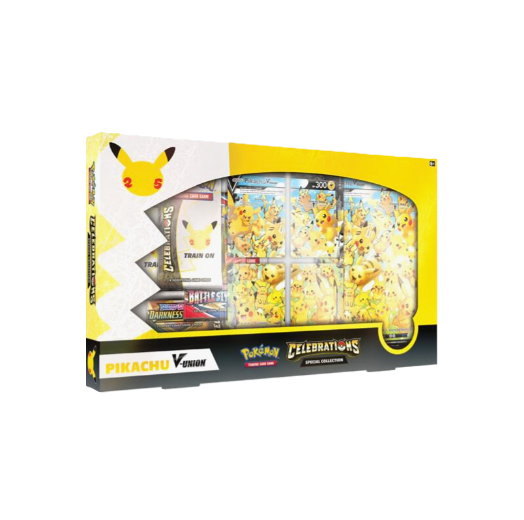 Inside this collection, you'll find 4 Pikachu V-UNION promo cards that come together to form a complete artwork, 1 oversized Pikachu V-UNION card, 1 celebratory promo card featuring Pikachu, 4 Celebrations booster packs, 2 additional TCG booster packs, and a Pokémon TCG coin to commemorate the occasion.