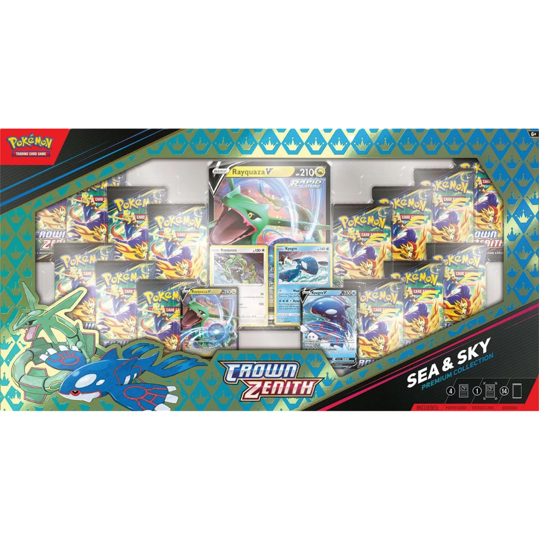 This majestic Crown Zenith: Sea & Sky Premium Collection is a breathtaking tribute to the forces of nature. Featuring stunning etched foil promo cards of Kyogre and Rayquaza, along with matching collector's pins and oversized cards, this set captures the epic clash between ocean depths and boundless skies.
