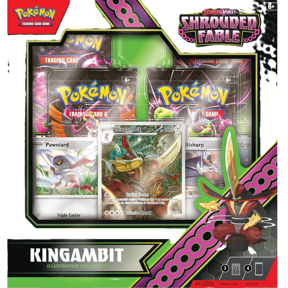 🌟 Step into the spotlight with the mighty Kingambit—the regal leader of Pawniard and Bisharp! This special collection features exclusive full-art foil cards that capture Kingambit’s commanding presence, making it a must-have centerpiece for any serious collection.