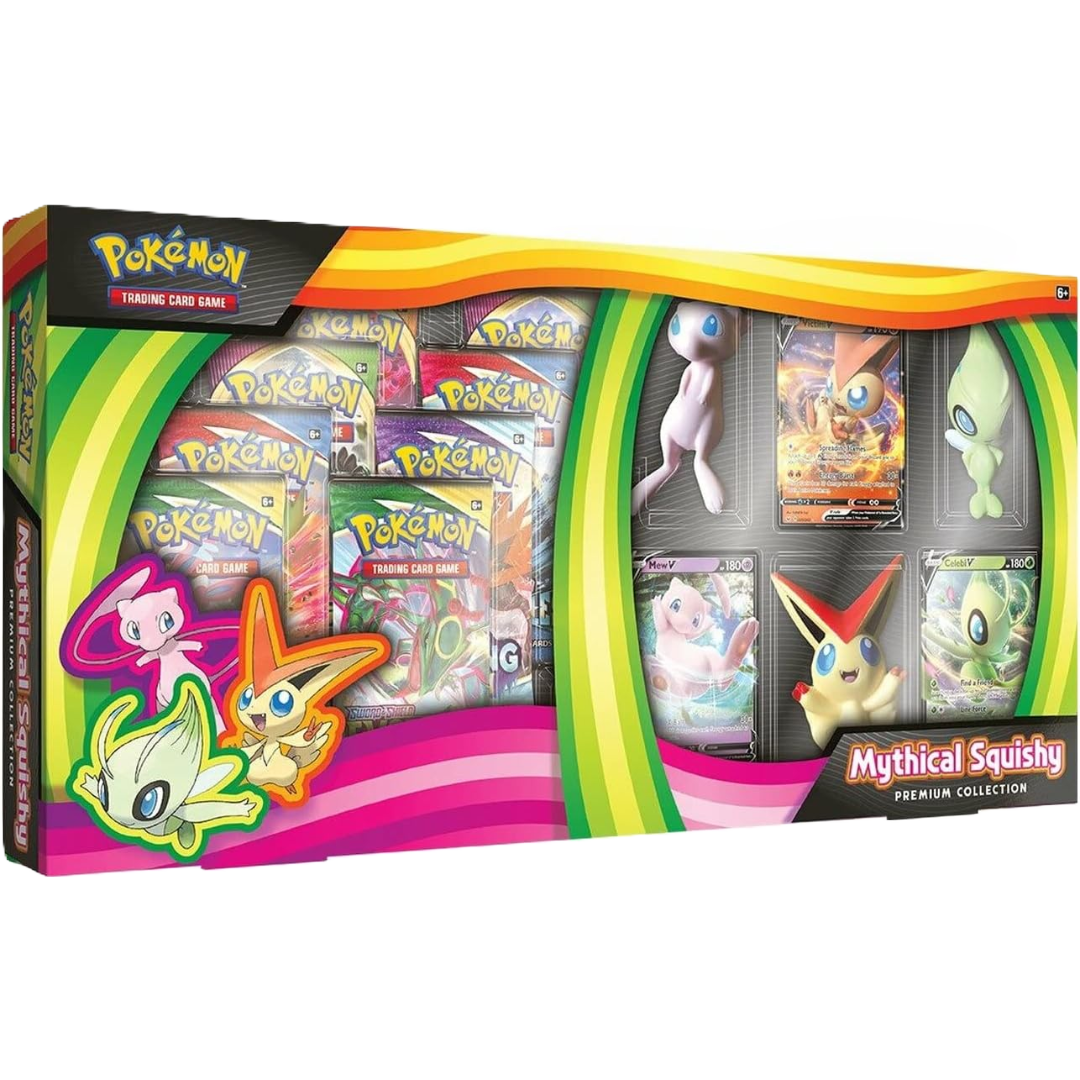 This playful Mythical Squishy Premium Collection is a whimsical must-have for any Pokémon collector. Featuring soft, squishy figures of Mew, Celebi, and Victini alongside their dazzling foil promo cards, this set brings mythical magic to life in a fun and unique way.
